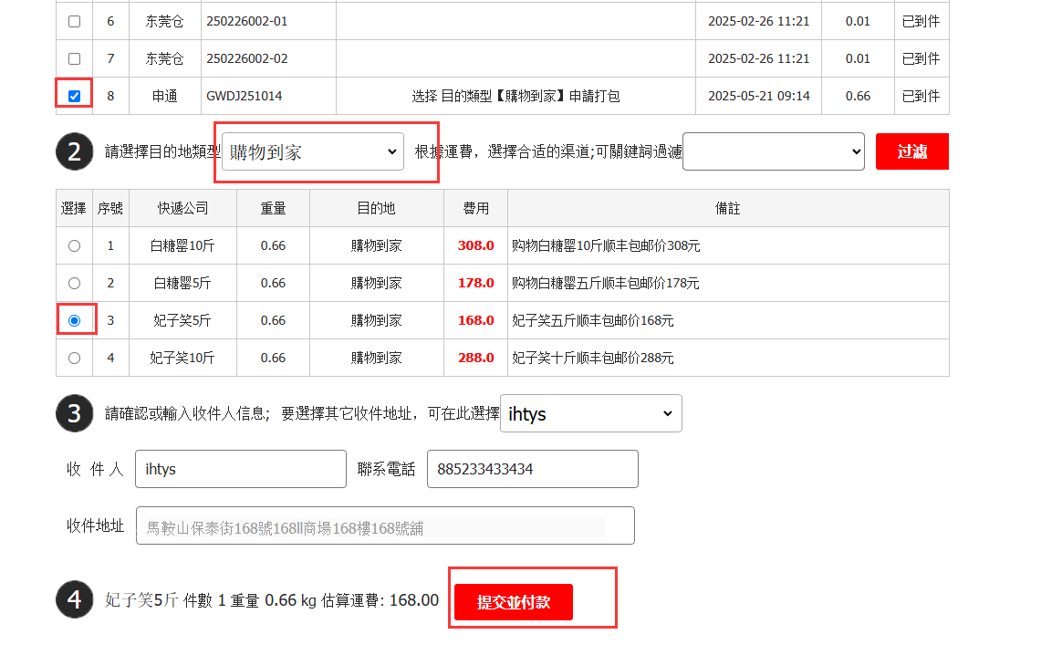 2 申请打包 刚才的虚拟入库单号,选择购买到家目的类型,确认收货地址,提交即可。这样想集运订单一样付款和查询物流信息。
